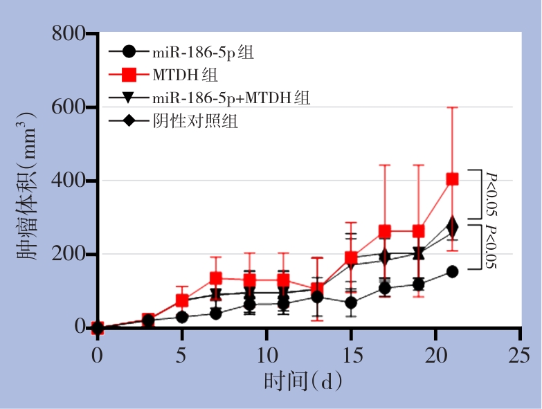 背景与目的 人表皮生长因子受体2(HER2)阳性乳腺癌侵袭性强、预后较差,微小RNA(miRNA)在其发生发展中发挥重要调控作用。miR-186-5p作为新近报道的肿瘤相关miRNA,其在HER2阳性乳腺癌中的作用机制尚未明确。本研究旨在探讨miR-186-5p对异黏蛋白(MTDH)的靶向调控关系及其对HER2阳性乳腺癌移植瘤生长的影响。方法 采用TargetScan预测miR-186-5p与MTDH的靶向结合位点,并通过双荧光素酶报告实验验证。构建miR-186-5p过表达、MTDH过表达及联合转染的BT-474细胞系,检测各组miR-186-5p与MTDH的mRNA和蛋白表达。将转染后的细胞接种于裸鼠皮下建立HER2阳性乳腺癌移植瘤模型,动态观察肿瘤生长情况,并于第28天测定肿瘤体积与质量,同时检测移植瘤组织中miR-186-5p和MTDH的表达水平。结果 双荧光素酶报告实验表明,miR-186-5p可直接靶向结合MTDH mRNA的3'-UTR。与阴性对照组比较,miR-186-5p过表达可明显下调MTDH mRNA及蛋白表达,而MTDH过表达可上调其表达,并可部分逆转miR-186-5p对MTDH的抑制作用(均P<0.05)。体内实验结果显示,miR-186-5p过表达组移植瘤的生长速度、肿瘤体积及质量均明显低于阴性对照组,MTDH过表达组则明显升高(均P<0.05),而miR-186-5p与MTDH联合转染组与阴性对照组差异无统计学意义(均P>0.05)。体内实验进一步证实,在移植瘤组织中,miR-186-5p过表达组miR-186-5p水平明显升高,MTDH的mRNA及蛋白表达明显下调;MTDH过表达组MTDH表达显著升高;联合转染组MTDH表达与阴性对照组差异无统计学意义(均P>0.05)。免疫组化结果与分子检测结果一致。结论 miR-186-5p可通过靶向抑制MTDH的表达,显著抑制HER2阳性乳腺癌小鼠移植瘤的生长,二者可能构成HER2阳性乳腺癌的重要调控通路,为其分子靶向治疗提供了新的实验依据。