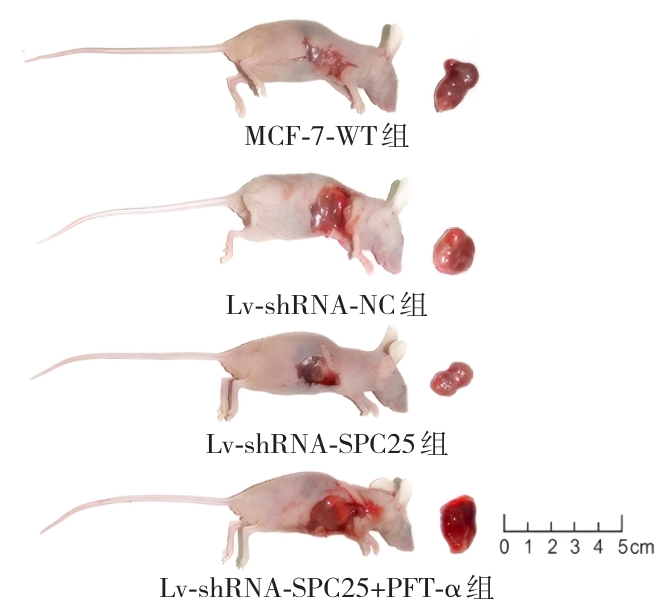 背景与目的 纺锤体极点构成蛋白25(SPC25)作为NDC80复合物的重要组成部分,在多种恶性肿瘤中异常高表达,但其在乳腺癌中的作用机制尚未明确。本研究旨在探讨SPC25是否通过调控p53信号通路影响乳腺癌细胞的增殖、迁移、侵袭及凋亡,从而阐明其在乳腺癌发生发展中的分子机制。方法 采用慢病毒介导的shRNA构建稳定沉默SPC25的乳腺癌MCF-7细胞系。通过qRT-PCR和Western blot检测SPC25及p53通路相关蛋白(p53、p21、BAX)的表达。采用平板克隆实验、划痕实验和Transwell实验分别评估细胞的增殖、迁移和侵袭能力,流式细胞术检测细胞凋亡情况。建立裸鼠皮下成瘤模型以观察移植瘤生长情况,并检测肿瘤组织中p53通路相关蛋白的表达。同时应用p53抑制剂PFT-α进行机制验证。结果 沉默SPC25显著抑制MCF-7细胞的增殖、迁移和侵袭能力,并促进细胞凋亡(均P<0.05)。与空白对照组比较,SPC25沉默后p53、p21和BAX蛋白表达明显上调(均P<0.05)。p53抑制剂PFT-α可逆转SPC25沉默对乳腺癌细胞增殖、迁移、侵袭及凋亡的影响,并下调p53、p21和BAX的表达(均P<0.05)。裸鼠成瘤实验显示,SPC25沉默明显降低移植瘤体积和质量,同时肿瘤组织中p53通路相关蛋白表达增加,而PFT-α干预可明显削弱上述抑制效应(均P<0.05)。结论 SPC25通过调控p53信号通路促进乳腺癌细胞的增殖、迁移和侵袭,并抑制细胞凋亡。SPC25可能作为乳腺癌潜在的分子治疗靶点,为其精准治疗提供新的理论依据。