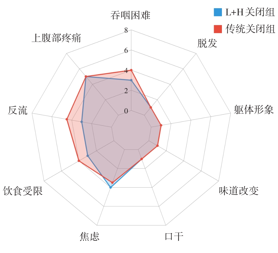 背景与目的 腹腔镜下食管空肠吻合是全腹腔镜全胃切除术(TLTG)的关键技术环节和操作难点,其吻合方式直接影响术后并发症发生率及患者生活质量。传统overlap吻合共同开口关闭方式在防止食管残端回缩及吻合口狭窄方面仍存在一定局限。本研究基于自牵引后离断(SPLT)技术,探讨采用线型+手工(L+H)方式关闭overlap吻合共同开口在TLTG中的安全性、可行性及其对术后生活质量的影响。方法 回顾性分析2024年5月1日—2025年6月1日江苏省扬中市人民医院胃肠外科行TLTG+D2淋巴结清扫的胃癌患者61例,根据overlap吻合共同开口关闭方式不同分为L+H关闭组(n=43)和传统关闭组(n=18)。比较两组患者术前临床及病理特征、术中相关指标、术后恢复情况、并发症发生率、消化道造影吻合口长径及术后3个月胃癌特异性生活质量量表(QLQ-STO22)评分。结果 两组患者在年龄、性别、基础疾病、美国麻醉医师协会分级、Siewert分型及病理分期等基线临床及病理特征方面差异均无统计学意义(均P>0.05)。两组手术均顺利完成,均获得R0切除且无中转开腹。L+H关闭组与传统关闭组在总手术时间、食管空肠吻合时间、术中出血量、淋巴结清扫数目、流质饮食开放时间及术后住院时间方面差异均无统计学意义(均P>0.05),术后并发症发生率差异亦无统计学意义(均P>0.05)。与传统关闭组相比,L+H关闭组消化道造影显示吻合口长径更大[(32.2±7.23)mm vs.(28.4±6.34)mm,P<0.05]。术后3个月随访中,L+H关闭组在QLQ-STO22量表的吞咽困难、反流、饮食受限维度评分及总评分均明显低于传统关闭组(均P<0.05)。结论 在SPLT-TLTG中,采用L+H方式关闭overlap吻合共同开口在不增加手术难度和围手术期并发症发生风险的前提下,可有效扩大吻合口长径,减轻术后吞咽困难、反流及饮食受限症状,显著改善患者术后生活质量,是一种安全、可行且具有推广价值的改良吻合技术。