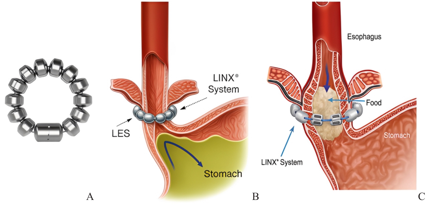 胃食管反流病(GERD)主要由食管下括约肌(LES)功能障碍所致,使胃内容物反流入食管,从而引发反流症状、黏膜损伤并降低生活质量。传统的抗反流手术方式,如Nissen、Toupet及Dor胃底折叠术,旨在增强LES功能并重建抗反流屏障的生理与机械组成部分,但术后吞咽困难、胀气综合征、持久性不足及远期复发等问题,限制了其更广泛的应用。随着微创外科技术的不断发展,假体型LES增强装置——包括磁性LINXTM系统和RefluxStopTM硅胶植入物——作为可逆、保留解剖结构的新型替代方案应运而生,其设计目标是在直接增强括约肌功能的同时,尽可能减少常见并发症的发生。本文综述了食管胃结合部的功能解剖、抗反流手术的基本原理以及胃底折叠术失败的机制。来自短期及长期随访研究的证据表明,磁性括约肌增强术及RefluxStop手术均可有效降低食管酸暴露,改善GERD相关生活质量,并在食管动力障碍或既往抗反流手术失败的患者中仍能获得持久的抗反流效果。这些技术是对传统胃底折叠术的重要补充,为GERD的个体化治疗提供了更加丰富的选择。未来,通过进一步优化患者筛选、手术技巧及长期疗效评估,将有助于明确 LES增强技术在现代抗反流外科中的最佳定位。